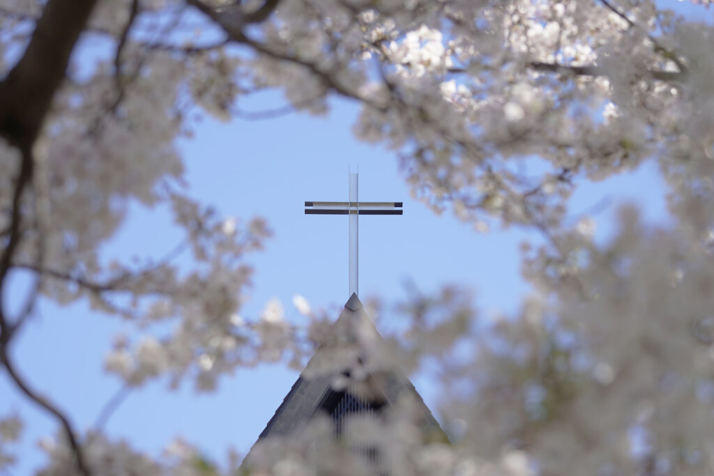 「日本基督教団 富士見町教会」です。ガラス張りで三角屋根のモダンな建築です