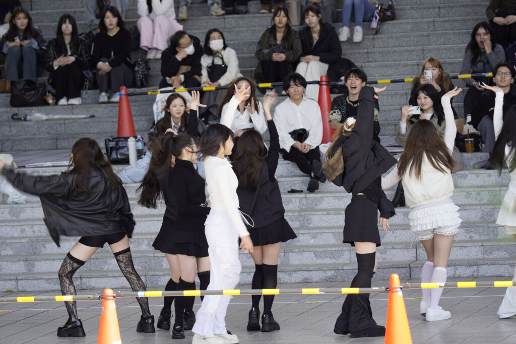 法政大学の校門広場で新入生歓迎のイベントが行われていました